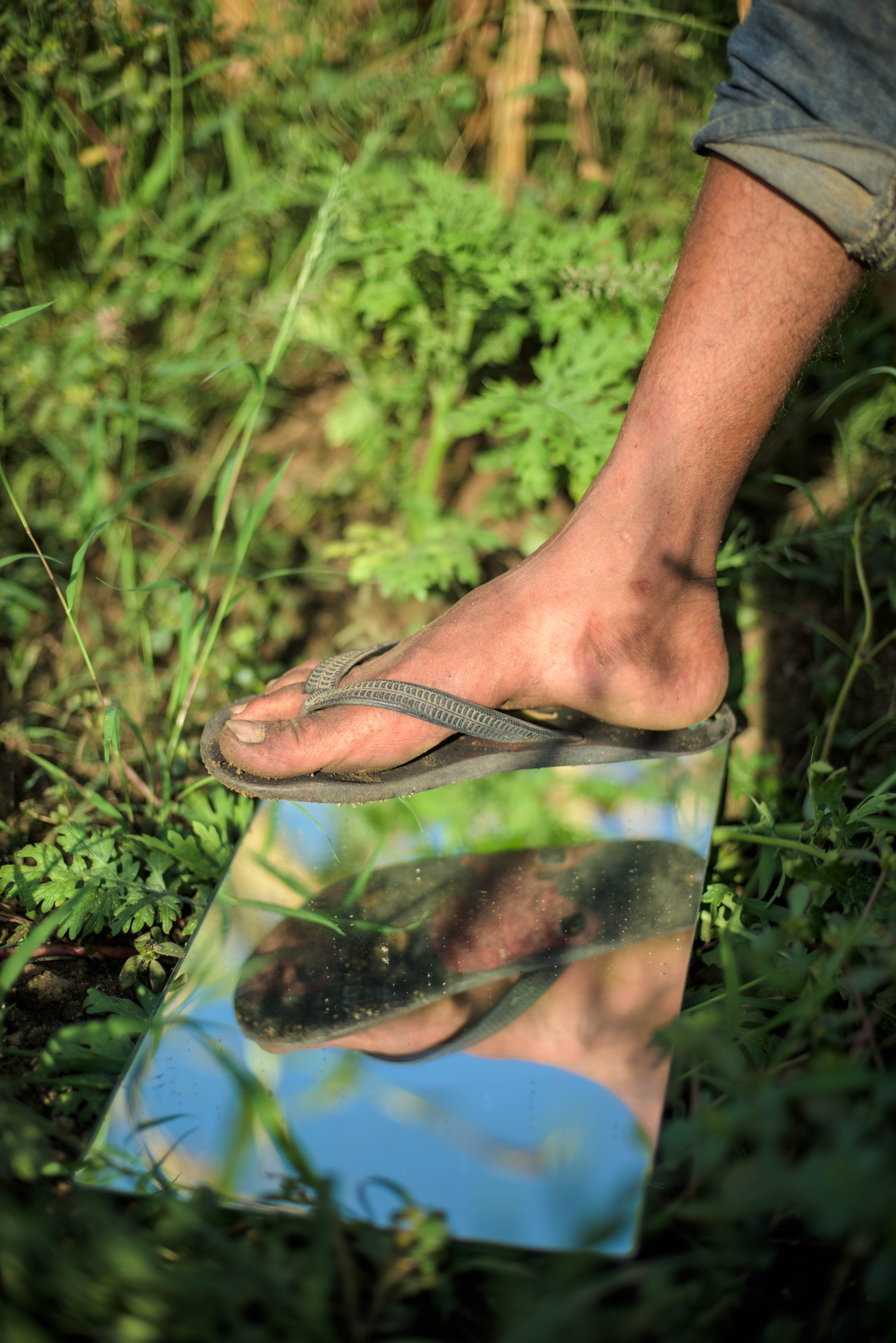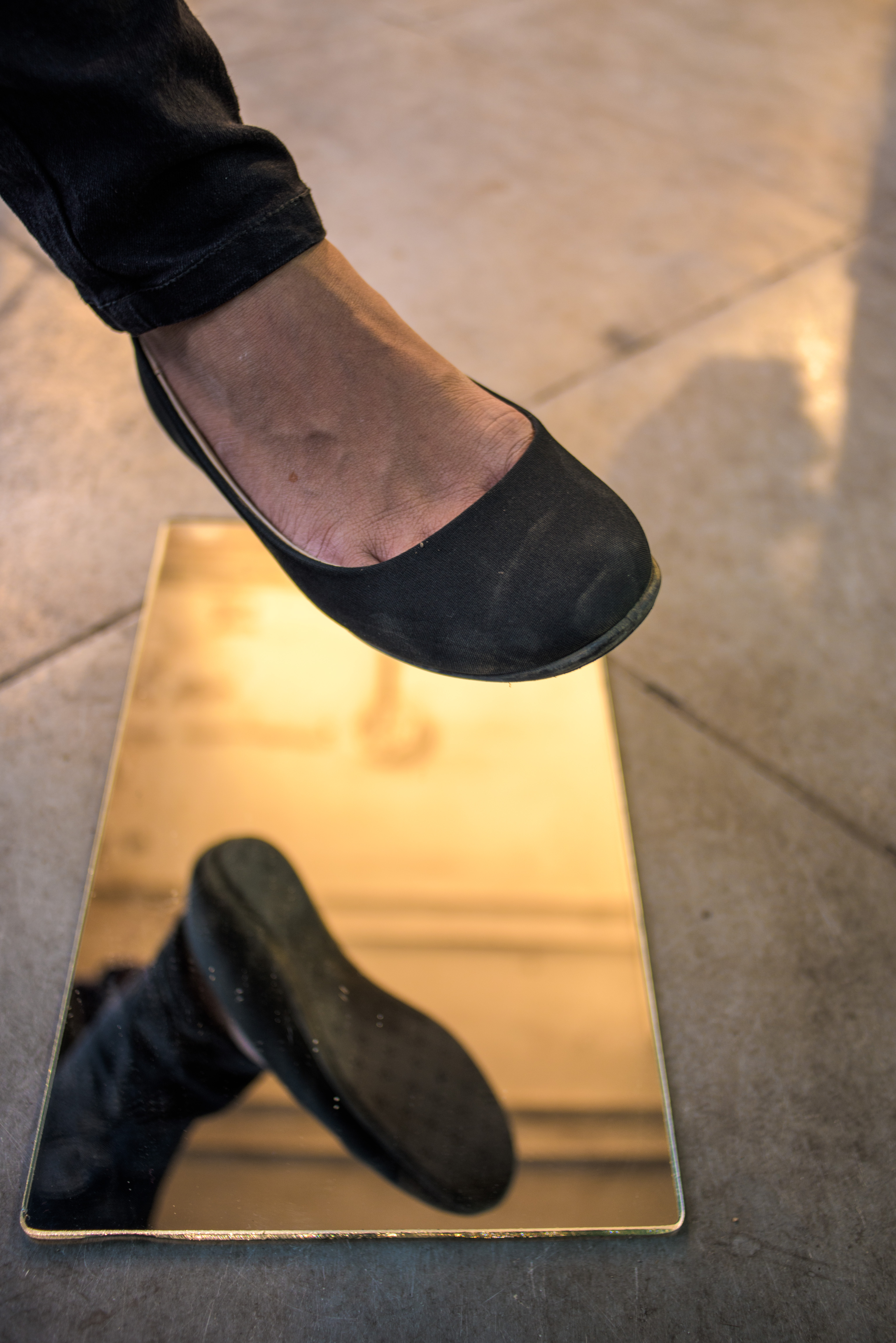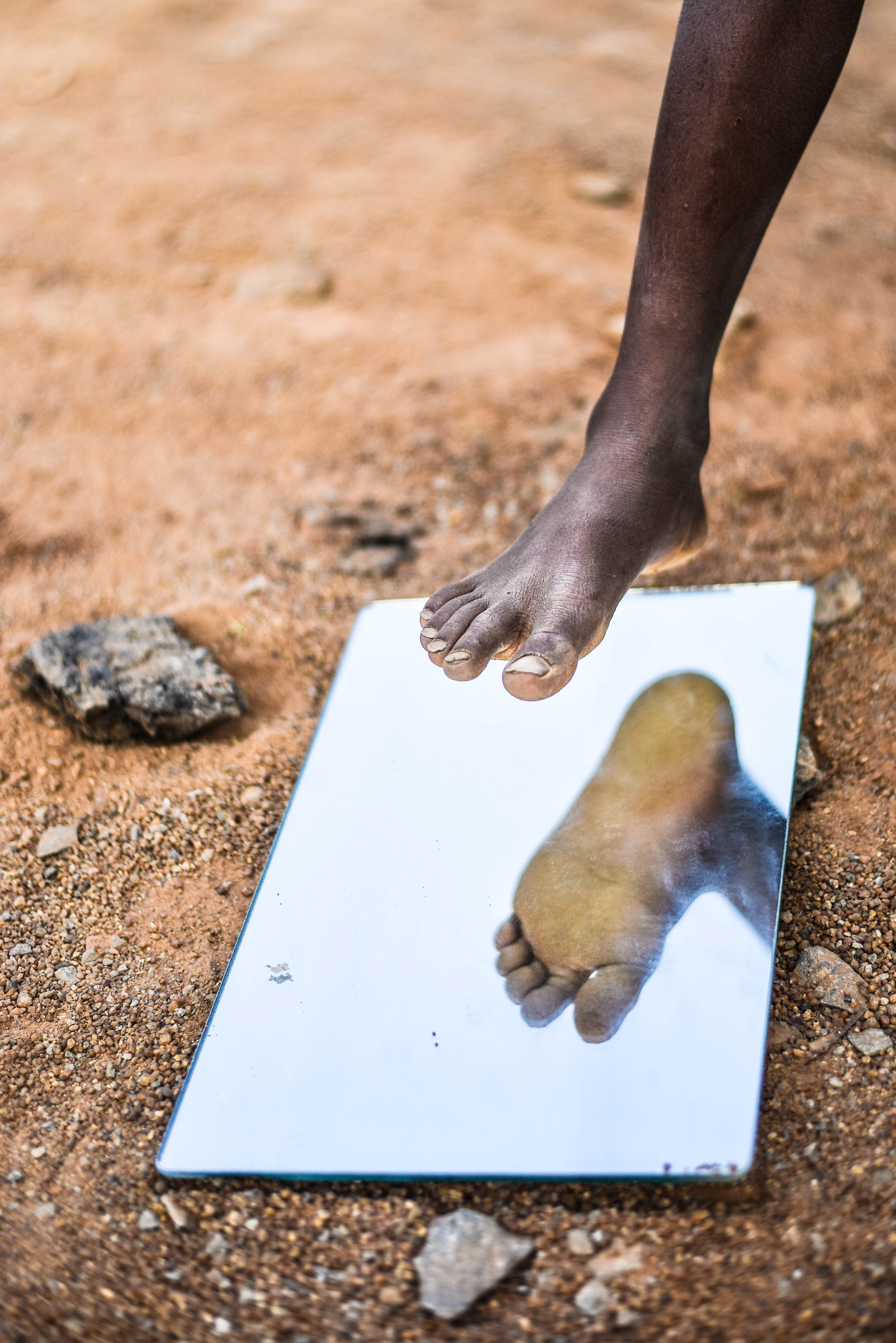 The sole of the foot is the only part of a walking person which is never seen, even when the person is naked. The images show various soles in their natural surroundings, being reflected on a mirror, acting as a frame within a frame; interpreted as viewing the souls through the soles, hence showing us the absolute truth. In the same frame, we also see the imprint it would leave behind; a pattern in their lifestyle.