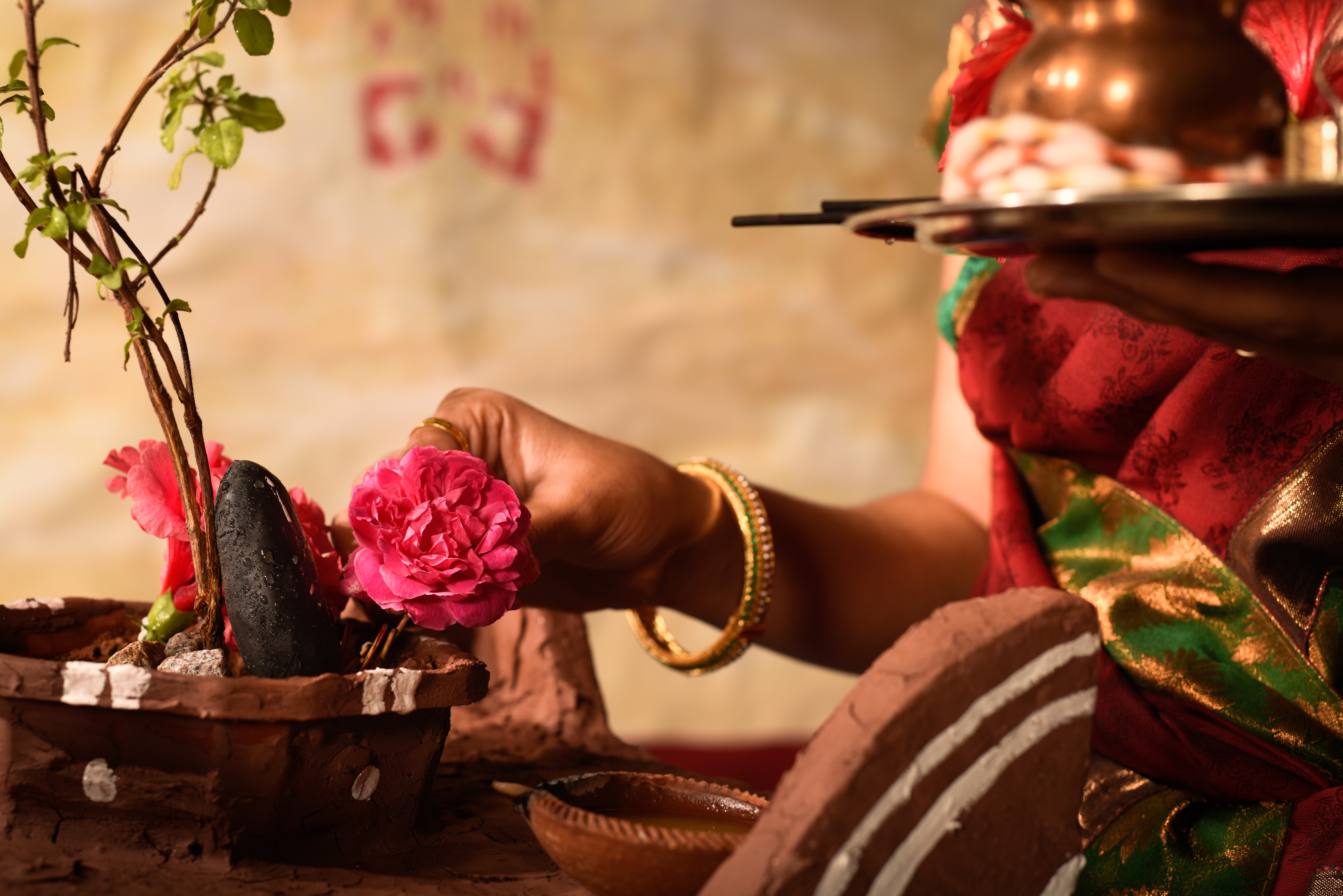 The tulsi vrindavan puja begins early in the morning with cleaning of the courtyard, followed by drawing kolams as a part of the decorations for the puja. Once the courtyard has been decorated, the vrindavan is cleaned. Flowers are offered to the tulsi plant, followed by the lighting of the lamp and incense sticks. The puja is completed with the offering of water during parikramās (circumambulation), as a sign of the removal of sins.
