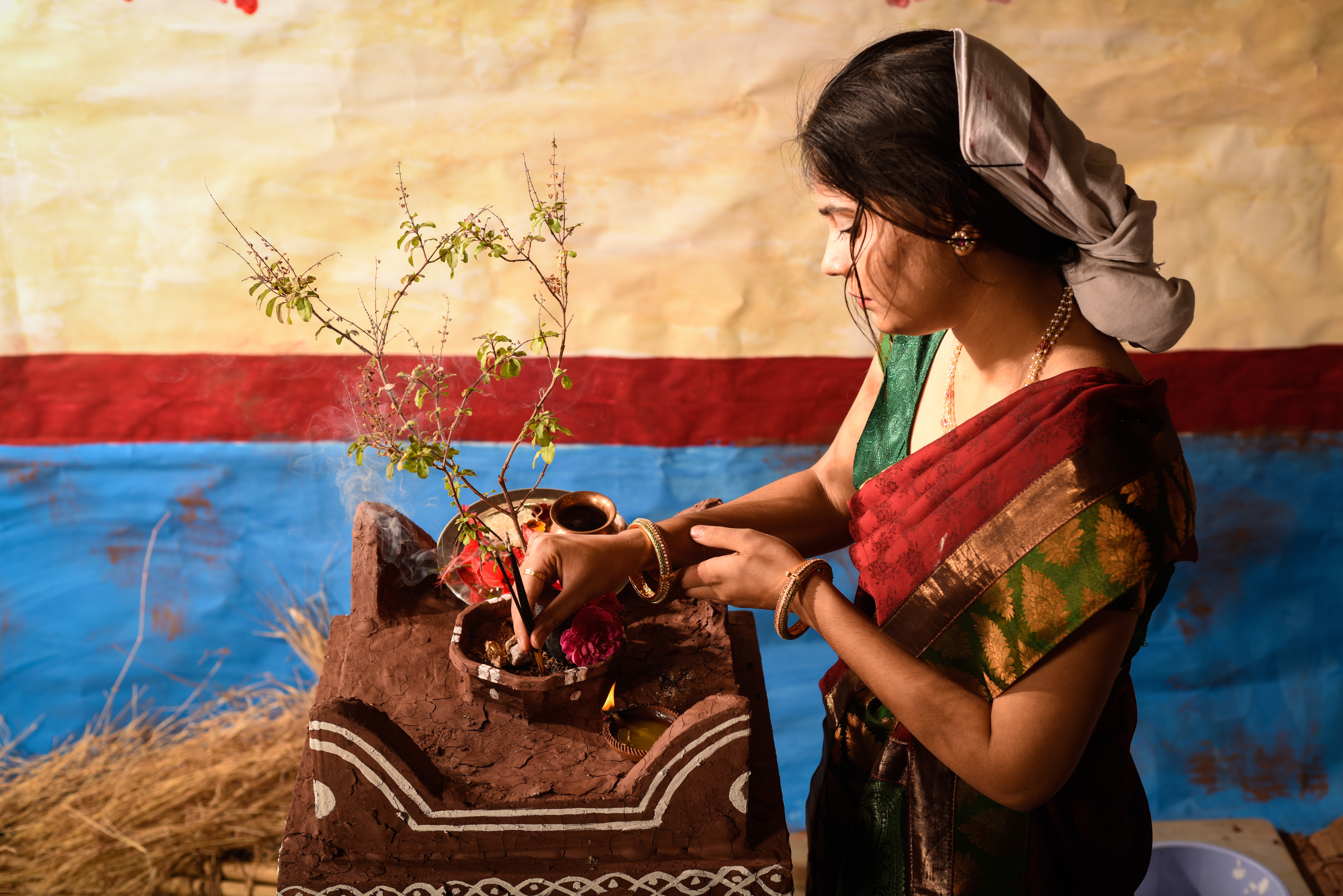 This project is an attempt at creating outdoor ambience inside a studio, representing the daily ritual of tulsi vrindavan puja and the processes thus involved. This puja is a part of most Hindu households and is associated with the longevity of a happily married life. The worshipping of the tulsi vrindavan generally takes place in the courtyard of the house.